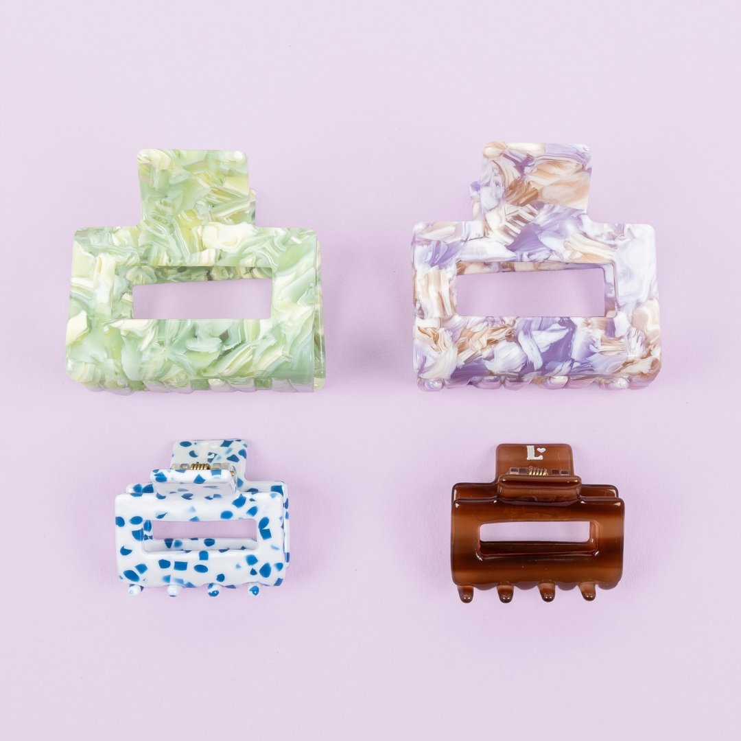 Our hair clips are made of cellulose acetate, a plant-based bioplastic certified by ISCC PLUS. Compared to petroleum-based plastic, acetate is more sustainable and biodegradable. The acetate and metal components have been tested and found to be free of harmful substances such as lead, cadmium, and phthalates.