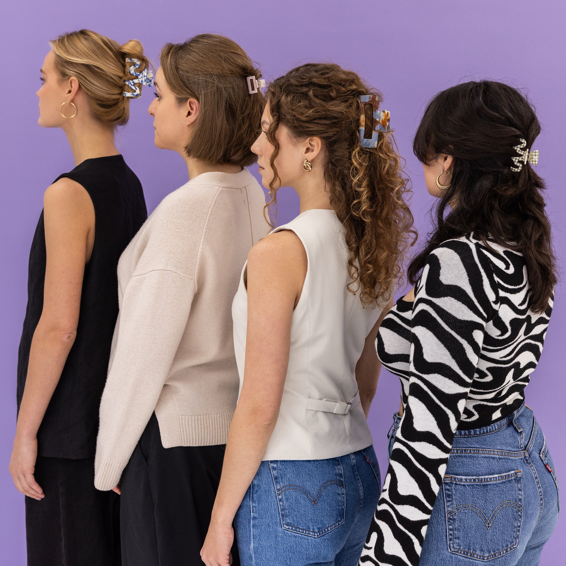Our hair clips are made of cellulose acetate, a plant-based bioplastic certified by ISCC PLUS. Compared to petroleum-based plastic, acetate is more sustainable and biodegradable. The acetate and metal components have been tested and found to be free of harmful substances such as lead, cadmium, and phthalates.