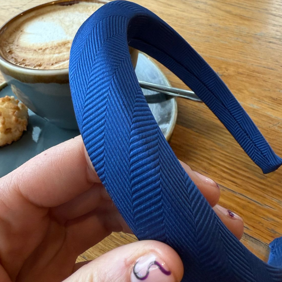 Esta diadema abullonada está hecha con una cinta y cuidadosamente terminada a mano con aguja e hilo. Es ligera, no aprieta detrás de las orejas y no contiene pegamento.