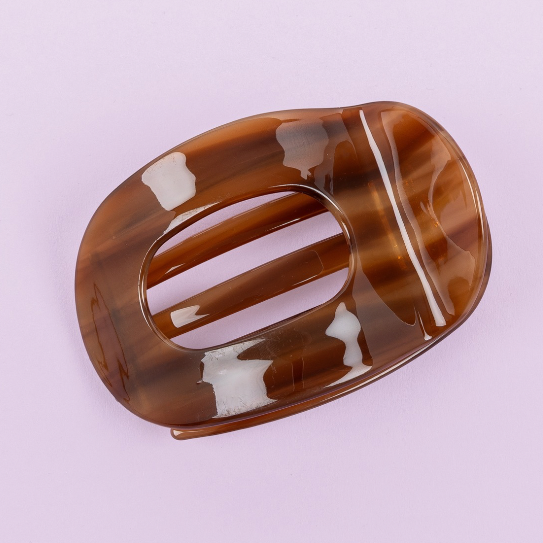 Nos barrettes sont fabriquées en acétate de cellulose, un bioplastique végétal certifié ISCC PLUS. Comparé au plastique issu du pétrole, l'acétate est plus durable et biodégradable. Les composants en acétate et en métal ont été testés et déclarés exempts de substances nocives comme le plomb, le cadmium et les phtalates.